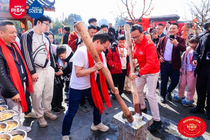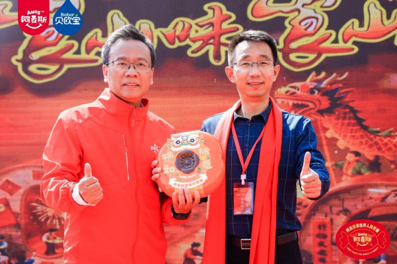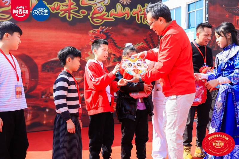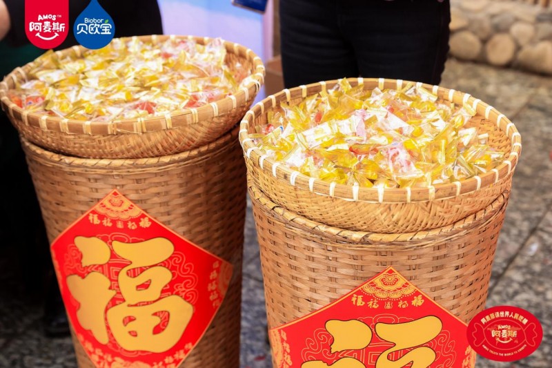 本次活动巧妙根植传统年俗,将甜蜜滋味融入烟火日常。在极具传统仪式感的 “年猪宴” 上,打糍粑、品米酒、逛民俗市集、赏非遗文化演出等特色活动轮番上演,沉浸式还原传统年味。身着民族服饰、佩戴Amos阿麦斯品牌标识的瑶族姑娘穿梭其间,向来往宾客热情派发糖果。在此起彼伏的欢呼声中,金多多食品集团无人机撒糖互动惊喜登场,将现场氛围推向一个又一个小高潮。本次无人机撒糖分多轮有序进行,共免费派发100斤糖果,将节庆的甜蜜与喜悦,悉数融化在宾客的笑容里。席间还特别设置了多轮抽奖环节,由金多多食品提供的“醒狮礼盒”、“柿柿如意”年糖礼盒接连送出,现场喜庆氛围不断升温,甜蜜滋味交织蔓延。