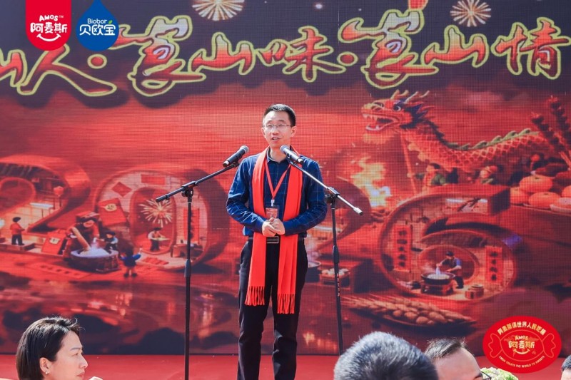 作为本次活动重要参与方代表,金多多食品集团董事长马恩多上台致辞。他向精心筹备本次“崀山过大年”活动的新宁县委、县政府,向所有为家乡发展默默付出的建设者,向此刻欢聚一堂的父老乡亲们,表示衷心的感谢,并欢迎大家来崀山吃糖!他说到:“我们生于新宁,长于斯土。夫夷江是母亲河,滋养血脉;崀山是精神峰,铸就脊梁。金多多食品集团的企业使命是做世界的甜蜜使者,2026年全球品牌推广主题是“Amos阿麦斯请世界人民吃糖”。我们相继在北京请奥运冠军吃糖,在内蒙古冰雪草原,请蒙古人民吃糖,在洛杉矶请格莱美歌星吃糖,在米兰冬奥会,请体育记者和冬奥冠军、意大利小朋友吃糖,现在特别高兴我们回到美丽的新宁崀山,请家乡人民吃糖。!”他同时宣布,金多多食品集团将启动 “为新宁人民送一吨糖” 春节公益行动。送糖行动由新宁县销售团队全程执行,将甜蜜礼包陆续送到全县群众手中,以实实在在的暖心举措,诠释企业与家乡人民共欢庆、同发展的深厚情谊。